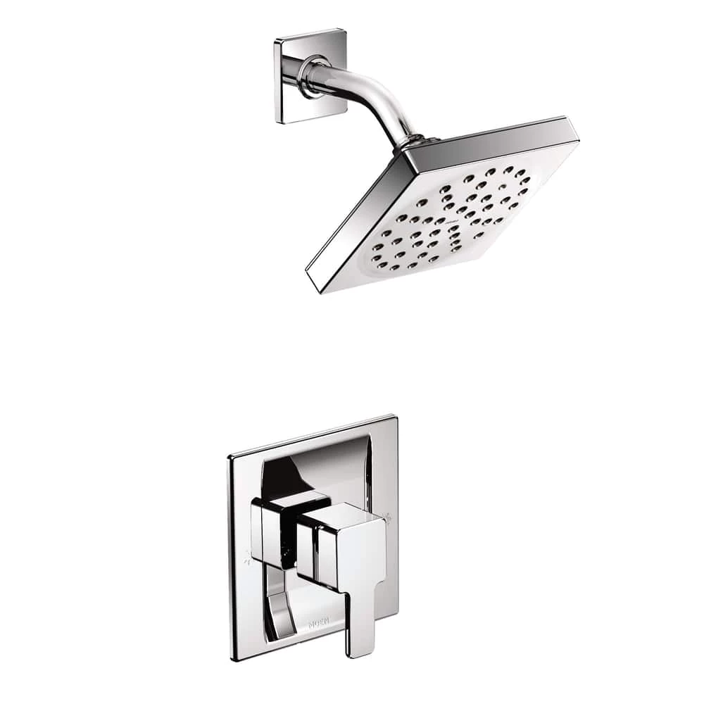 - Moen 90 Degree Posi-Temp Modern Shower Trim Kit is highly reflective for a mirror-like look that works with any decorating style