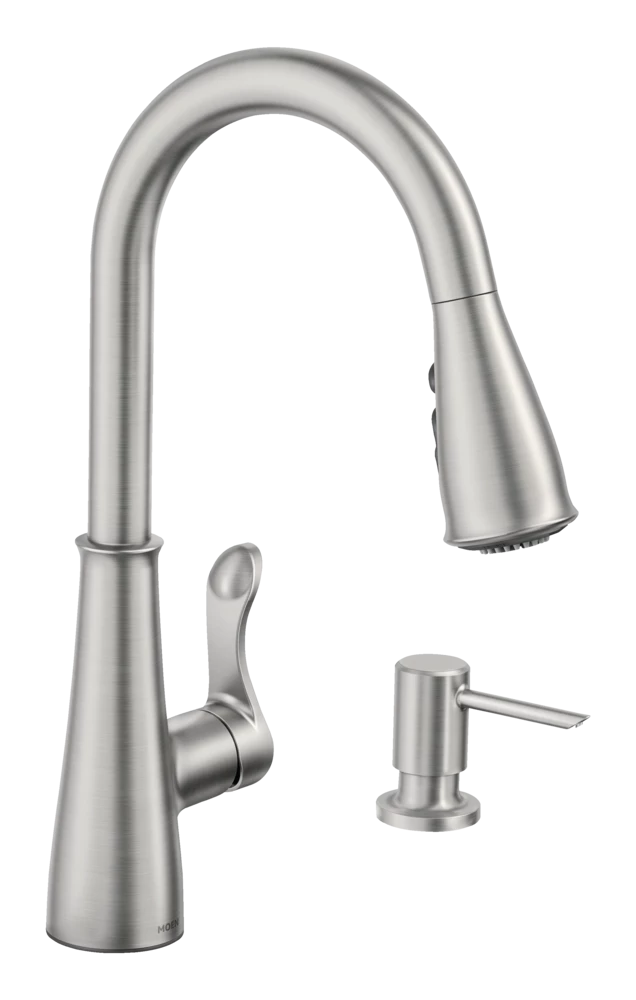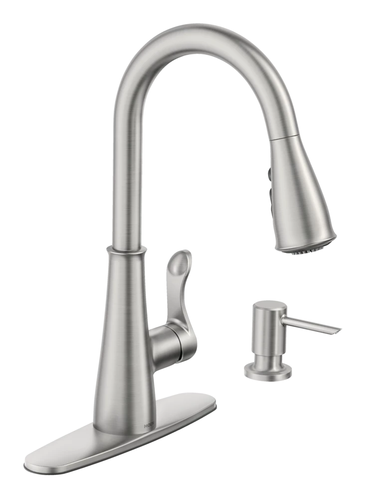 - Moen Hadley 1-Handle Kitchen Faucet and Soap Dispenser features Spot Resist® stainless steel finish that resists fingerprints and water spots