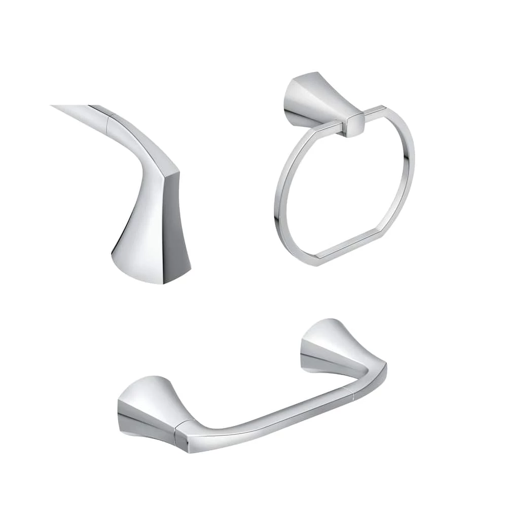 - Kit includes (1) 18” (45.7 cm) towel bar, (1) towel ring, and (1) toilet paper holder