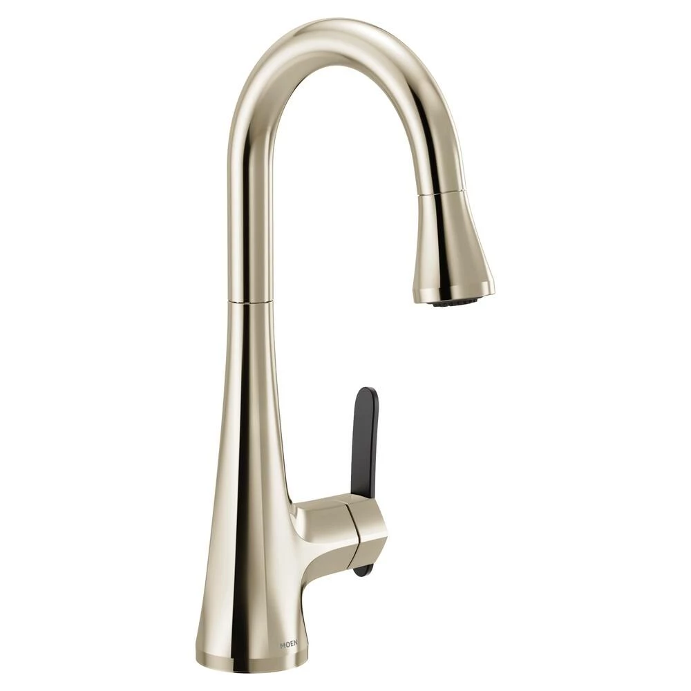 - Moen Sinema 1-Handle Pulldown Bar Faucet features a polished nickel finish that provides a mirror-like warm metallic look, adding a refined touch to your space